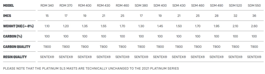 Die PLATINUM SLS-Serie wurde für Weltcup-Profis und alle anderen entwickelt, die das Beste erwarten. Seitdem wurde die Serie kontinuierlich weiterentwickelt. Der hochindividuelle, extrem dynamische PLATINUM RDM, der nach den Designvorgaben des AERO 1.0 produziert wird, hat über 30% weniger Gewicht, aber nichts an Haltbarkeit gegenüber den Vorgängermodellen verloren. Selbst unter härtesten Bedingungen verwendet der Wave-Weltmeister Victor Fernandez nur diese Masten. Alle SDM-Varianten, insbesondere die Modelle mit größerer Länge, sind für Wettkämpfe ausgelegt und durch die abriebfeste POLY.SHIELD-Oberfläche auch vor Kratzern geschützt. Sowohl RDMs als auch SDMs werden mit der AEROSPACE PREPREG TECHNOLOGY hergestellt – dem präzisesten und hochwertigsten Verfahren, das es gibt.
