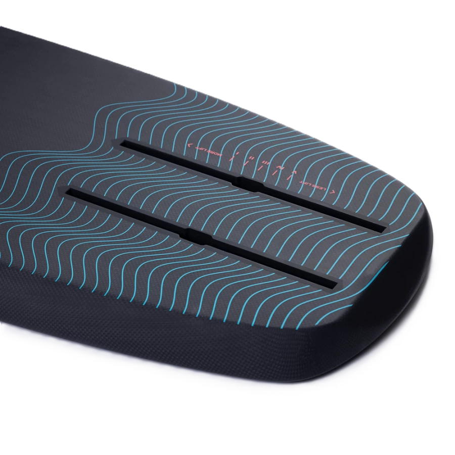 Die Rails liegen gut in der Hand und die langlebige 3K Carbon Konstruktion mit solidem High-Density Kern macht das Board steif und reaktionsschnell.Das schlichte Design und das leicht vertiefte Deck verbessern die Verbindung zum Foil bei Manövern und erlauben eine schnelle Anpassung der Fußposition.