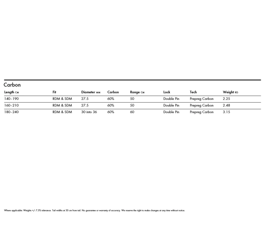 Wide and stiff tail ends. Same great feel. Better for the budget. An RDB (Reduced Diameter Boom), it’s slimmer than standard booms, and a touch thicker than Goya’s „Carbon Skinny Pro“. Smaller sizes are 27.5 mm, larger models are 30 mm.