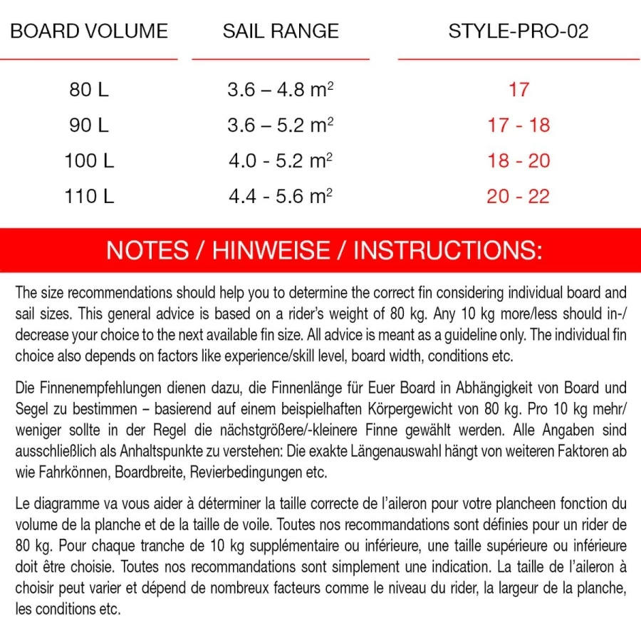 Die Style-Pro-02 vervollständigt unsere Freestyle-Serie. Ein neues Profil ermöglicht frühes Angleiten, extrem hohe Geschwindigkeiten und einen kraftvollen Absprung für besonders hohe Moves. Die ideale Finne für New-School-Freestyle und die Wahl vieler Top-PWA-Freestyler (u. a. WM-Titel 2018 für Sarah-Quita Offringa, Vize-Weltmeister Adrien Bosson und Maaike Huvermann).