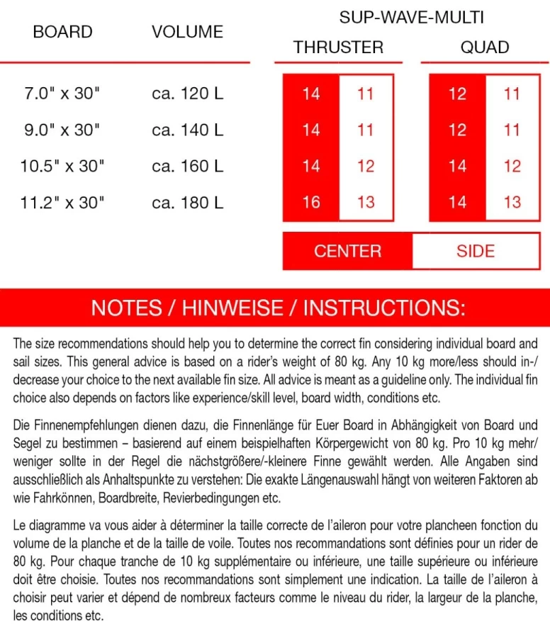 Unsere SUP-Wave-Multi-Finnen sind das Ergebnis einer mehrjährigen Entwicklungsarbeit mit der dänischen Windsurf- und SUP-Ikone Lars Petersen. Sie sind als Thruster- und Quad-Sets verfügbar: schnelle, steife und robuste G-10-Center-Finnen mit halb-profilierten Honeycomb-Seitenfinnen für sehr schnelle und aggressive carving Turns.