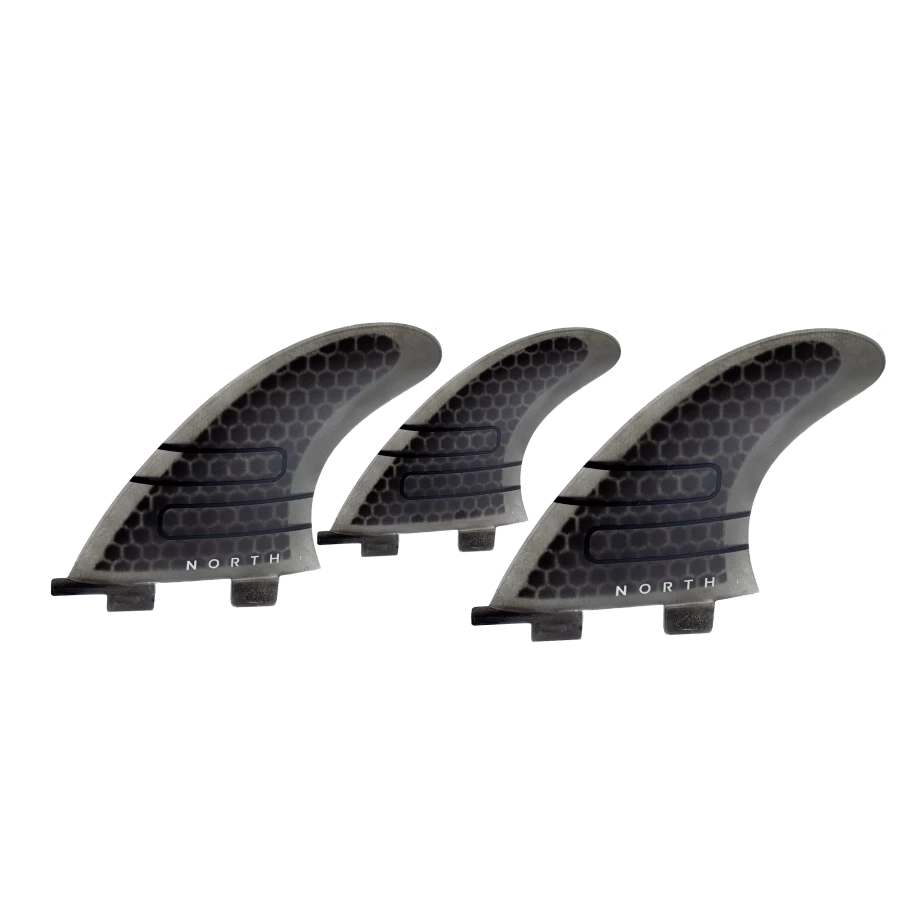 Lightweight hexagonal-core thruster fins are designed to maintain the flex characteristics of a glass fin with optimum strength to weight ratio. The custom fin base shape means no infills are required when using with FCSII Fin Boxes. Large fins are more raked and carve well with hold. Medium fins are more upright with less tip area, creating minimal drag for more speed and release.