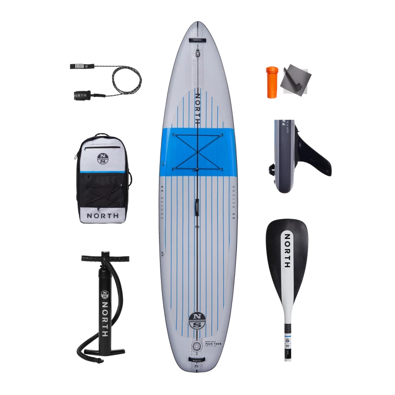 Includes (fallback): Paddle, leash, fin, pump, transport bag, repair kit