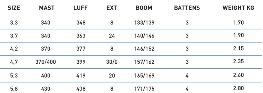| Size | Mast | Mast type | Luff | EXT | Boom | Battens | Cams | Weight Kg |