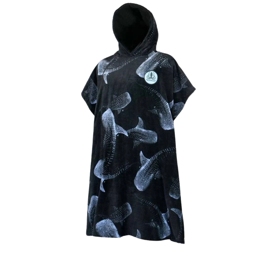 Poncho in schwarz mit einem tollen Design und Kapuze, um sich vor und nach den Sessions in Ruhe umzuziehen und warm zu halten.